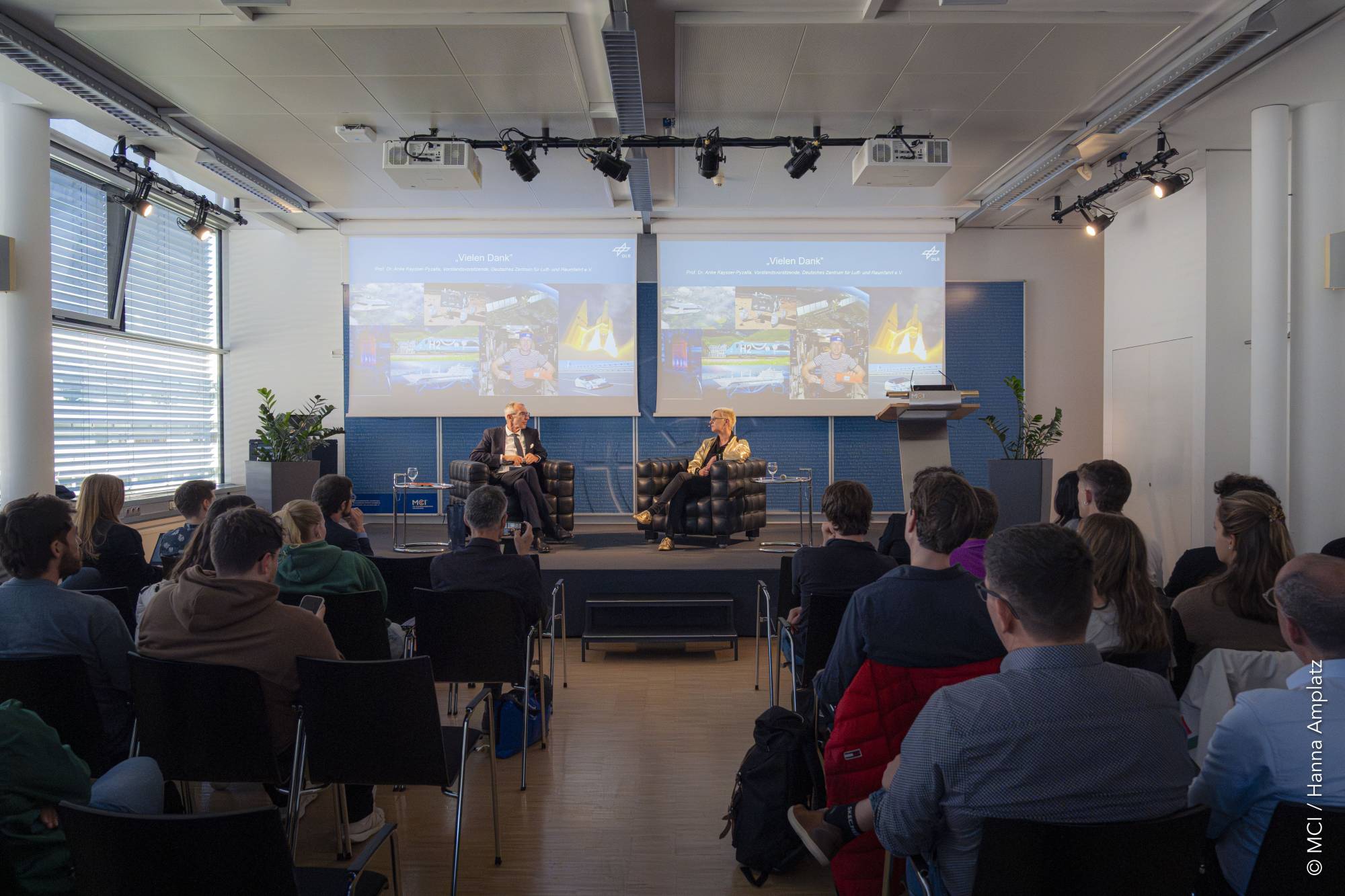 In der anschließenden Diskussion mit MCI Rektor Andreas Altmann und dem Publikum thematisierte Kaysser-Pyzalla auch die wachsenden Herausforderungen im Weltraum. Der zunehmende Weltraummüll, fehlende regulatorische Standards und gezielte Zerstörungen von Satelliten durch staatliche Akteure stellten nicht nur sicherheitspolitische, sondern auch wirtschaftliche Risiken dar. Jedes Ausweichmanöver koste wertvolle Lebensdauer der Satelliten.