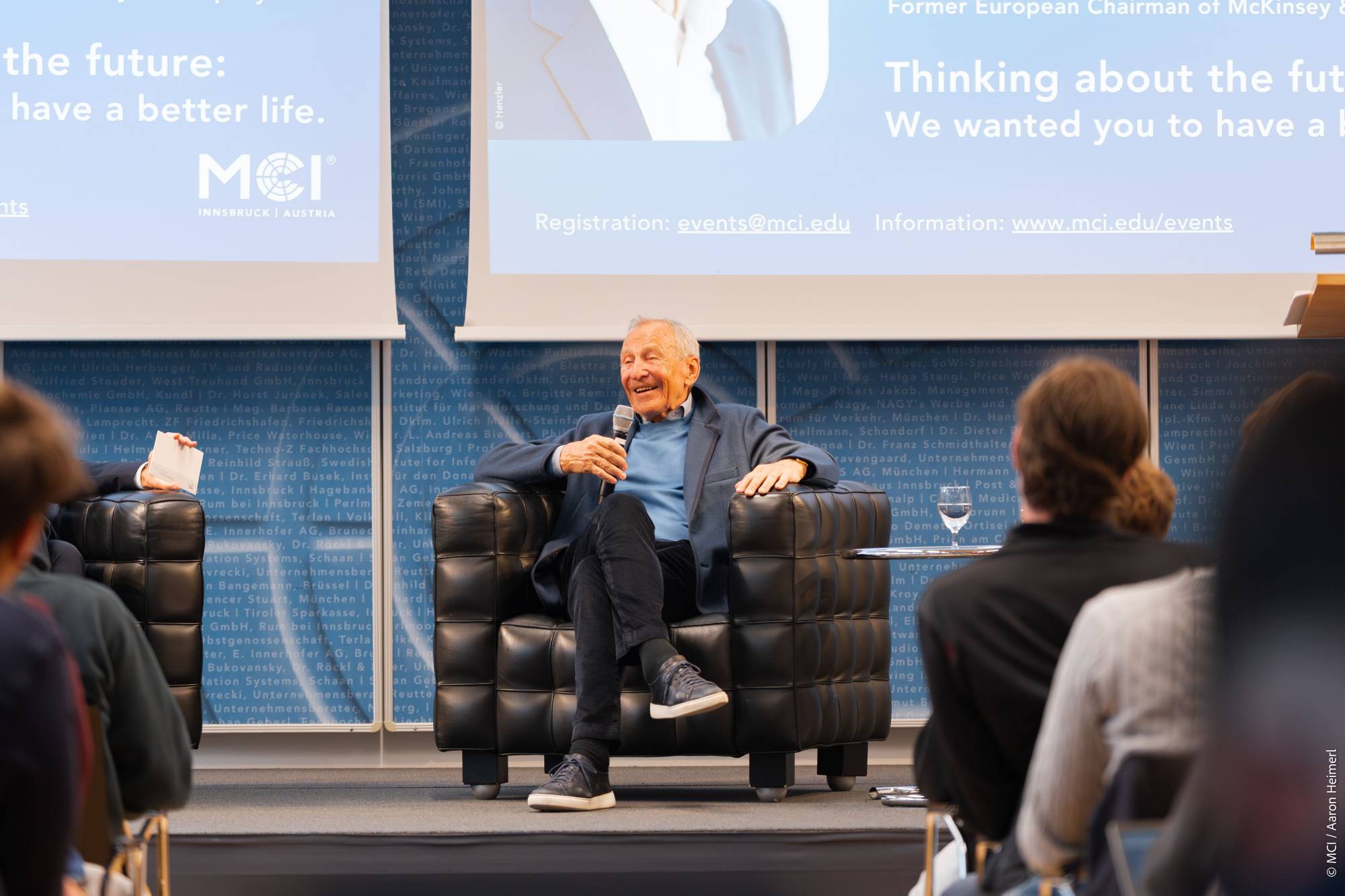 Mit Herbert Henzler begrüßte das MCI einen der renommiertesten Managementberater im deutschsprachigen Raum. Der frühere Europa-Vorsitzende von McKinsey & Company sprach über gesellschaftliche Umbrüche, wirtschaftliche Entwicklungen und die Zukunftsperspektiven junger Menschen in Europa.