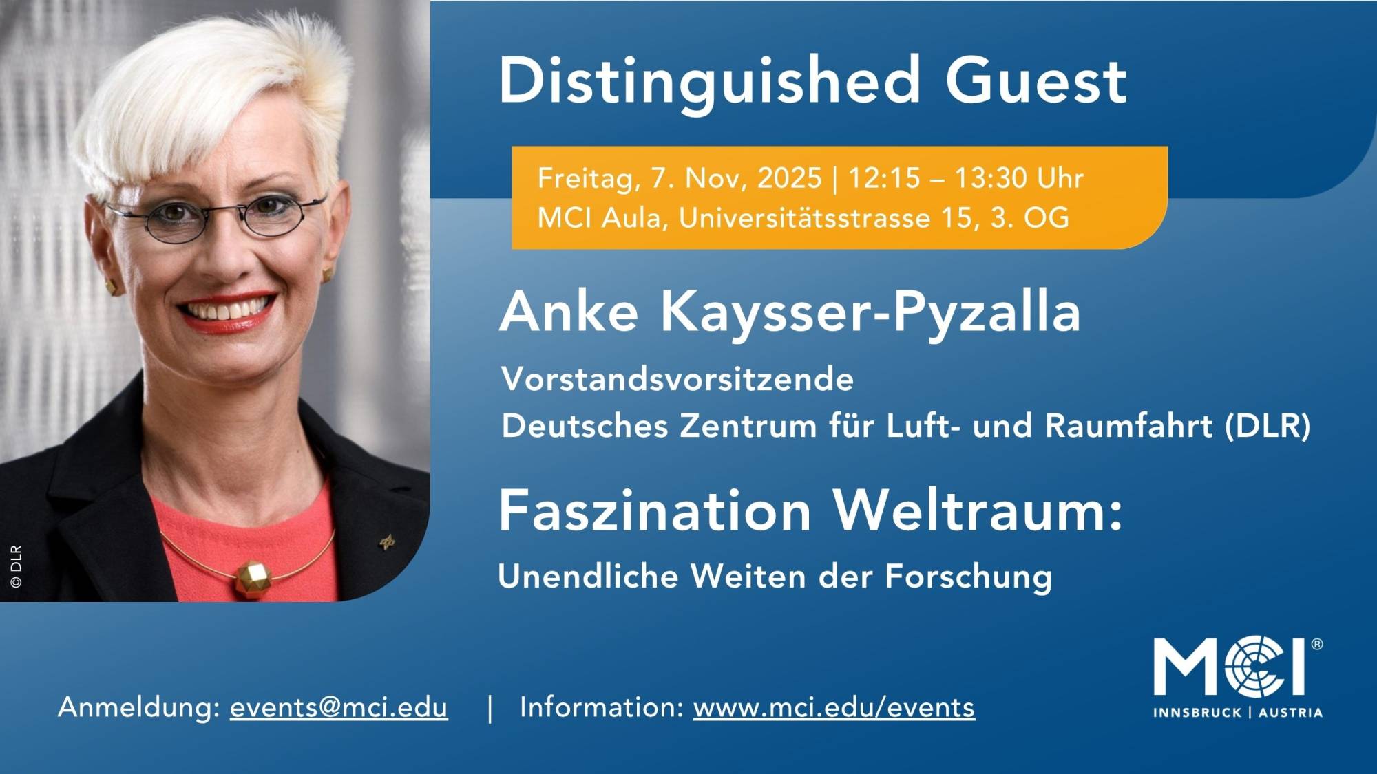 Prof. Dr.-Ing. Anke Kaysser-Pyzalla ist seit dem 1. Oktober 2020 Vorstandsvorsitzende im Deutschen Zentrum für Luft- und Raumfahrt e. V. (DLR). Sie promovierte und habilitierte an der Ruhr-Universität Bochum. Nach Forschungstätigkeiten am Hahn-Meitner-Institut (HMI) und an der TU Berlin forschte und lehrte sie von 2003 bis 2005 als Universitätsprofessorin an der Technischen Universität Wien.2005 wechselte sie als Wissenschaftliches Mitglied, Direktorin und Geschäftsführerin in die Leitung der Max-Planck-Institut für Eisenforschung GmbH nach Düsseldorf. 2008 folgte die Berufung zurWissenschaftlichen Geschäftsführerin der Helmholtz-Zentrum Berlin für Materialien und Energie GmbH, die unter ihrer Leitung aus der Fusion von HMI und BESSY entstand. Von Mai 2017 bis zumAmtsantritt beim DLR war Anke Kaysser-Pyzalla Präsidentin der Technischen Universität Braunschweig.