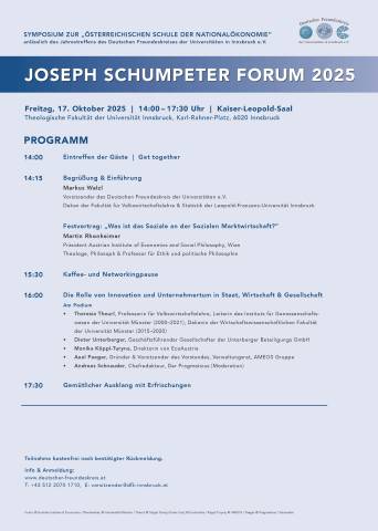 Joseph Schumpeter Forum 2025Symposium zur Österreichischen Schule der Nationalökonomie Festvortrag von Prof. Dr. Martin Rhonheimer „Was ist das Soziale an der Sozialen Marktwirtschaft?“ Podiumsdiskussion mit hochrangigen Persönlichkeiten aus Wissenschaft & Wirtschaft