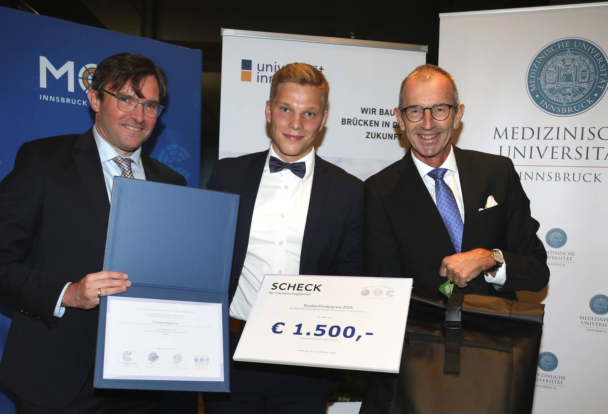V.l.n.r.: Markus Walzl (Vorsitzender DFK), Gabriel Ellemund, MCI Rektor Andreas Altmann ©Frischauf Bild