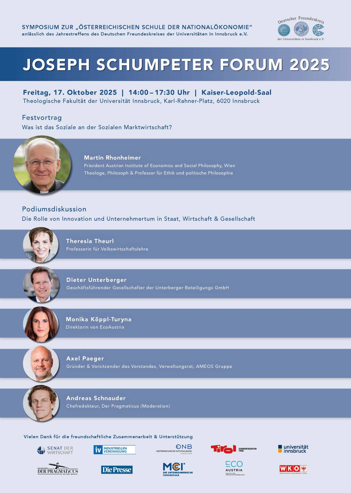 Anlässlich des diesjährigen DFK-Jahrestreffen in Innsbruck fand vor kurzem das vierte Joseph Schumpeter Forum statt. Damit soll die große Tradition und ungebrochene Aktualität der renommierten „Österreichischen Schule der Nationalökonomie“ gewürdigt und deren bis heute ungebrochen gültigen Erkenntnisse für die aktuellen wirtschaftspolitischen Herausforderungen herangezogen werden.