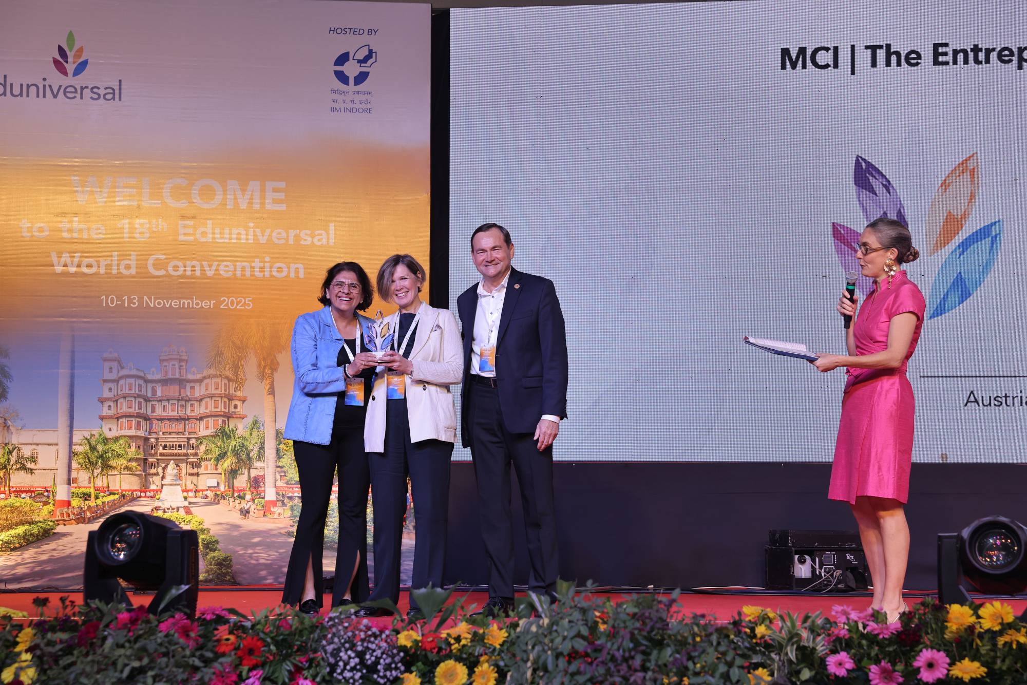 Leena Kasbekar und Susanne Lichtmannegger (v.l.) nehmen die Auszeichnung für das MCI bei der Eduniversal World Convention in Indore, Indien, entgegen. ©Eduniversal