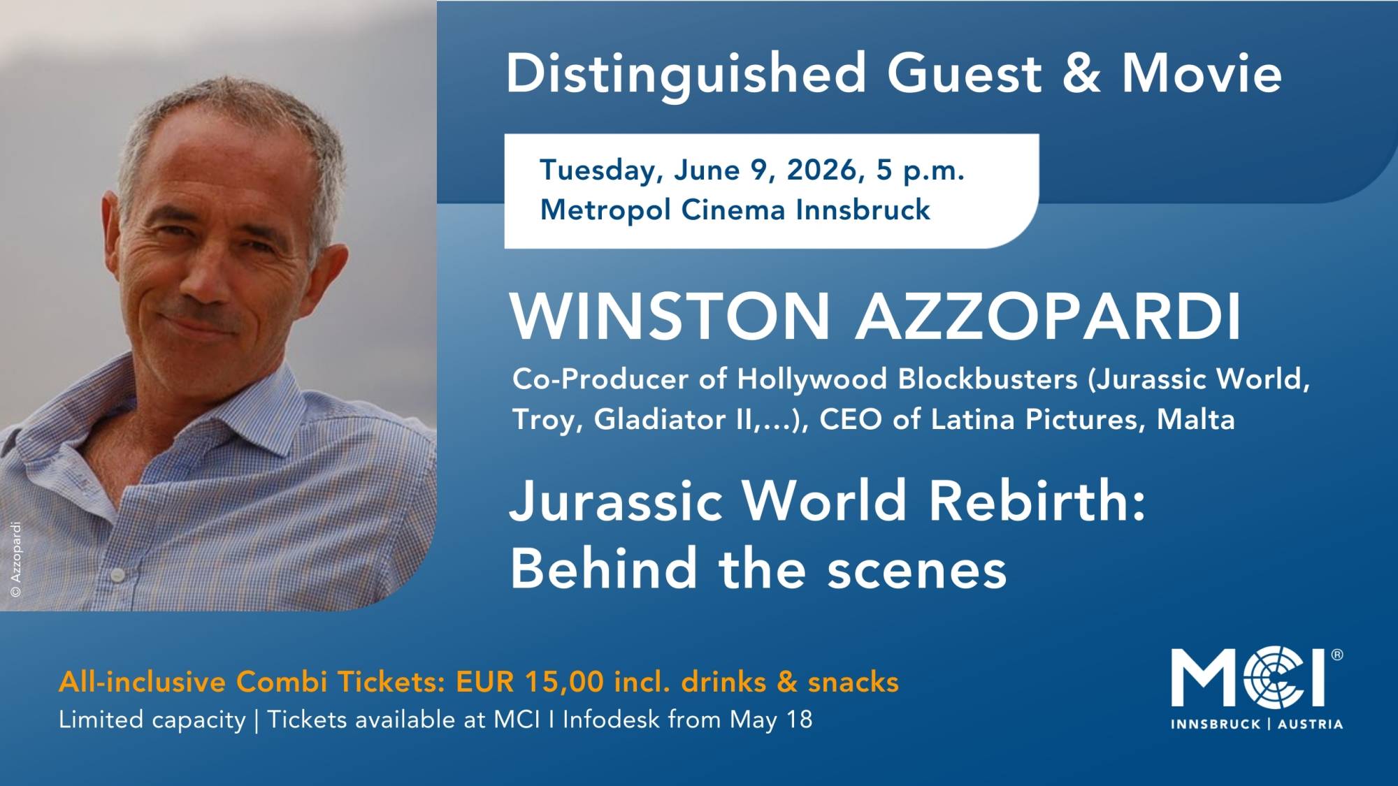 All-inclusive Combi Tickets: EUR 15,- incl. drinks & snacksLimited capacity | Tickets available at MCI I Infodesk from May 18